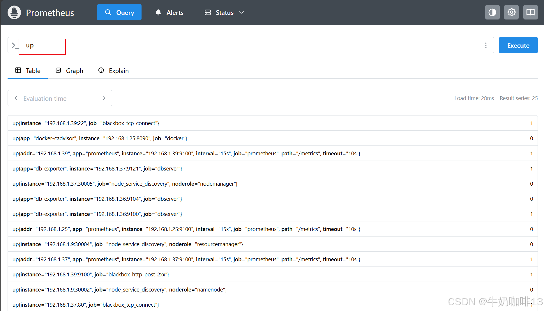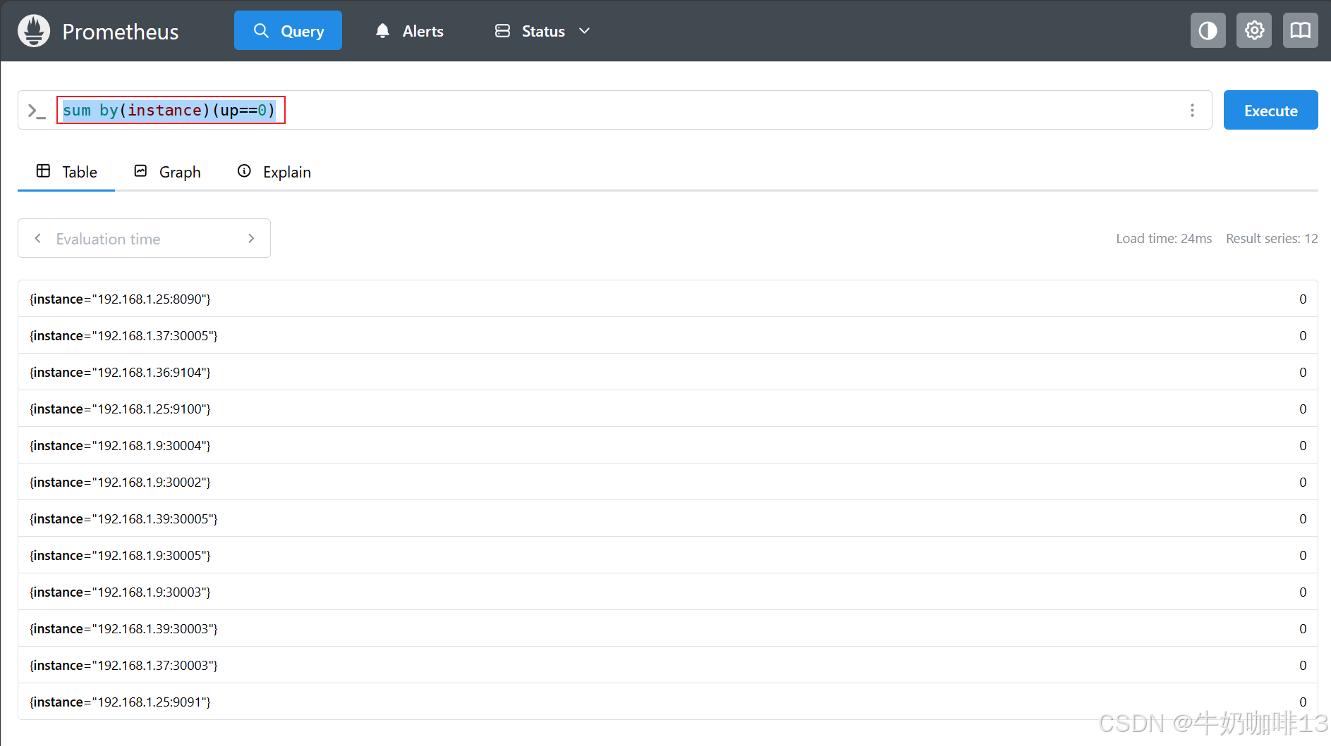 每当 prometheus 抓取一个目标时,它都会存储一个合成的样本(其中包含指标名称 up 和被抓取实例的 job 和 instance 标签),如果抓取成功,则样本的值被设置为 1,如果抓取失败,则设置为 0,因此可以通过下面的查询来获取当前哪些实例处于正常或挂掉的状态: