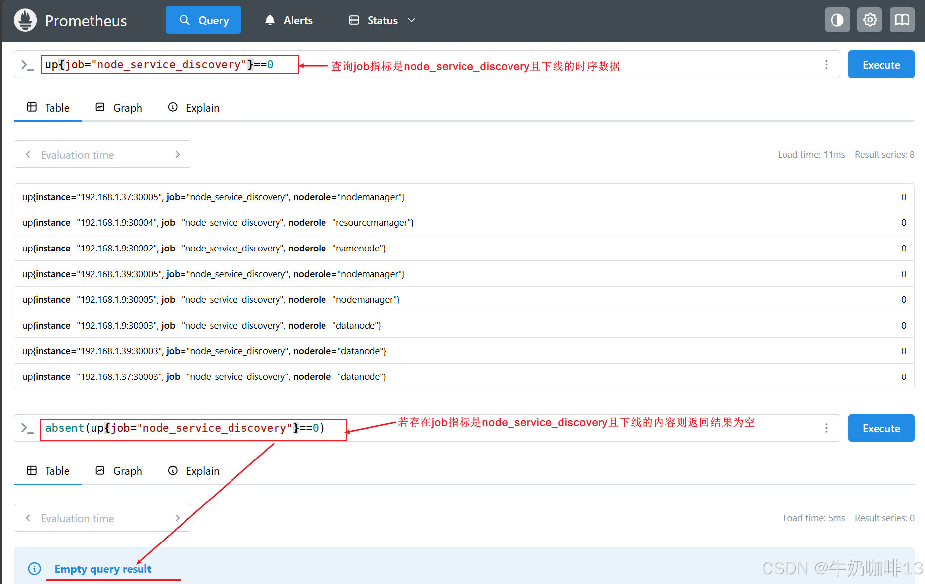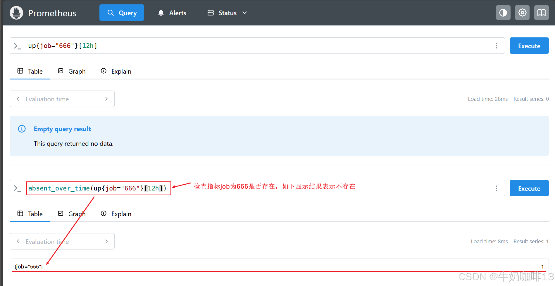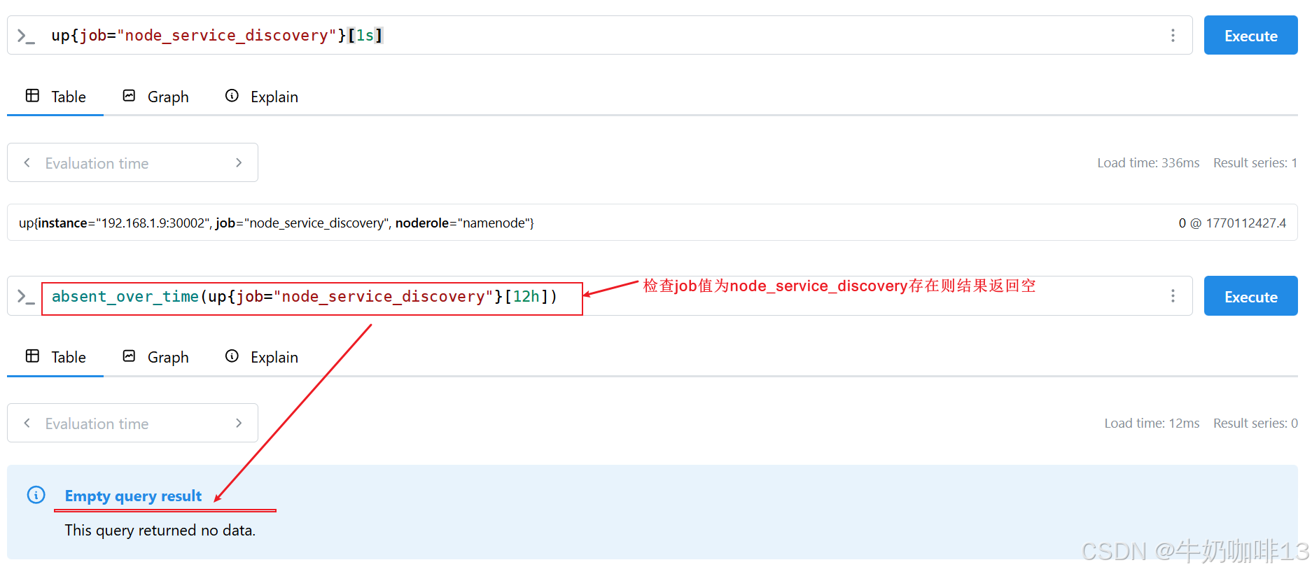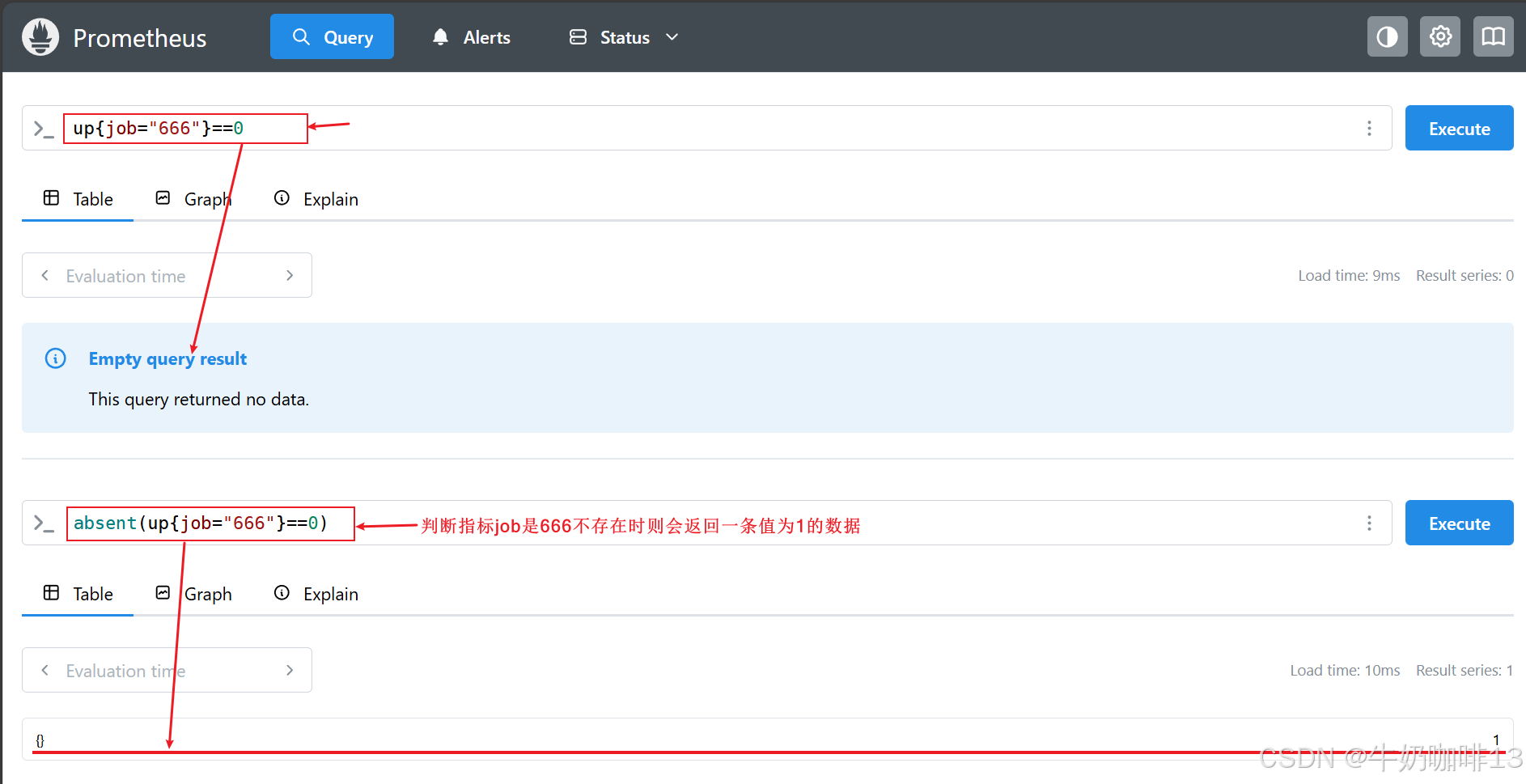 在某些情况下,只查看实例的状态是不够的,有时还需要检测是否存在某些序列,上面我们用【up == 0】语句来查询所有无法抓取的实例服务,但是只有已经被抓取过的目标才会被加上 up 指标,如果 Prometheus 都没有抓取到任何的实例服务目标,应该怎么办呢?【此时,absent() 函数就非常有用了,absent() 将一个瞬时向量作为其输入,当输入一个已存在的序列时,将返回一个空结果,不存在时,将返回单个输出序列,而且样本值为1 】。此外还有一个 函数【absent_over_time() 】,它接受一个区间向量,告诉我们,在该输入向量的指定时间范围内是否有样本(当输入一个已存在的序列时,将返回一个空结果,不存在时,将返回单个输出序列,而且样本值为1)。