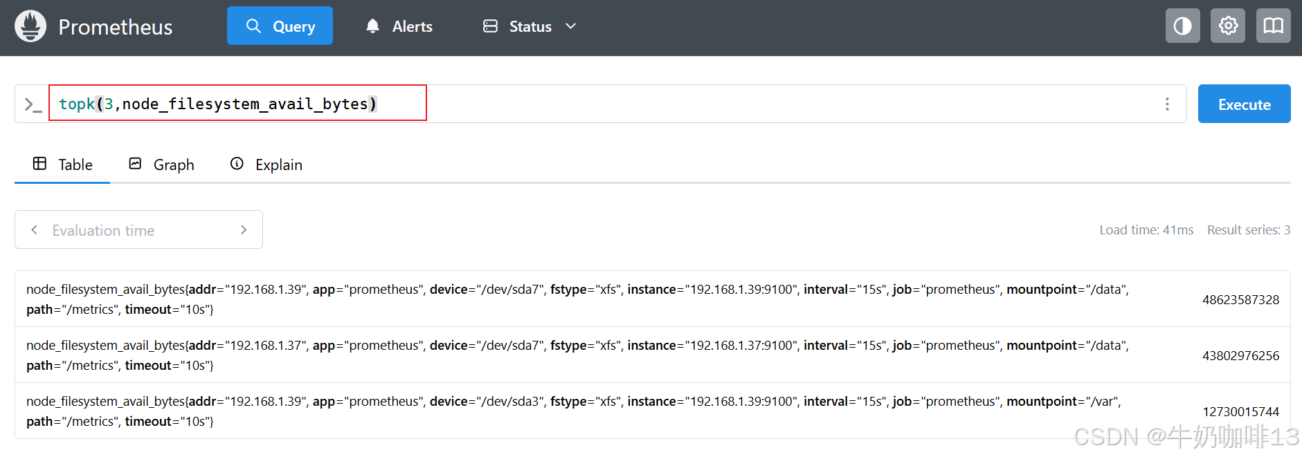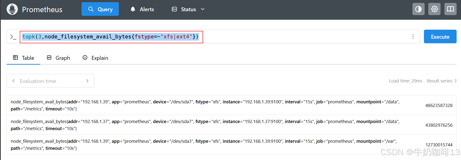 topk(3,node_filesystem_avail_bytes{fstype=~"xfs|ext4"})