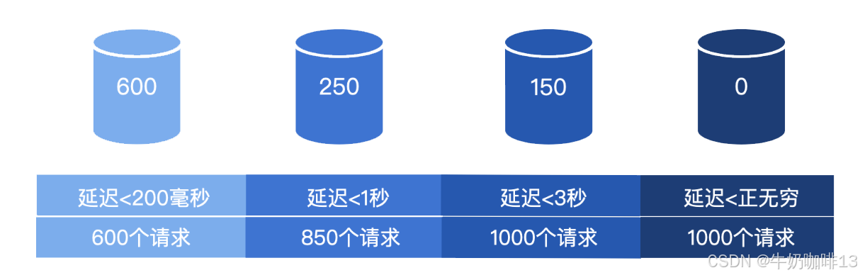 《1》延迟小于 200 毫秒的,有 600 个请求落到了这个区间。