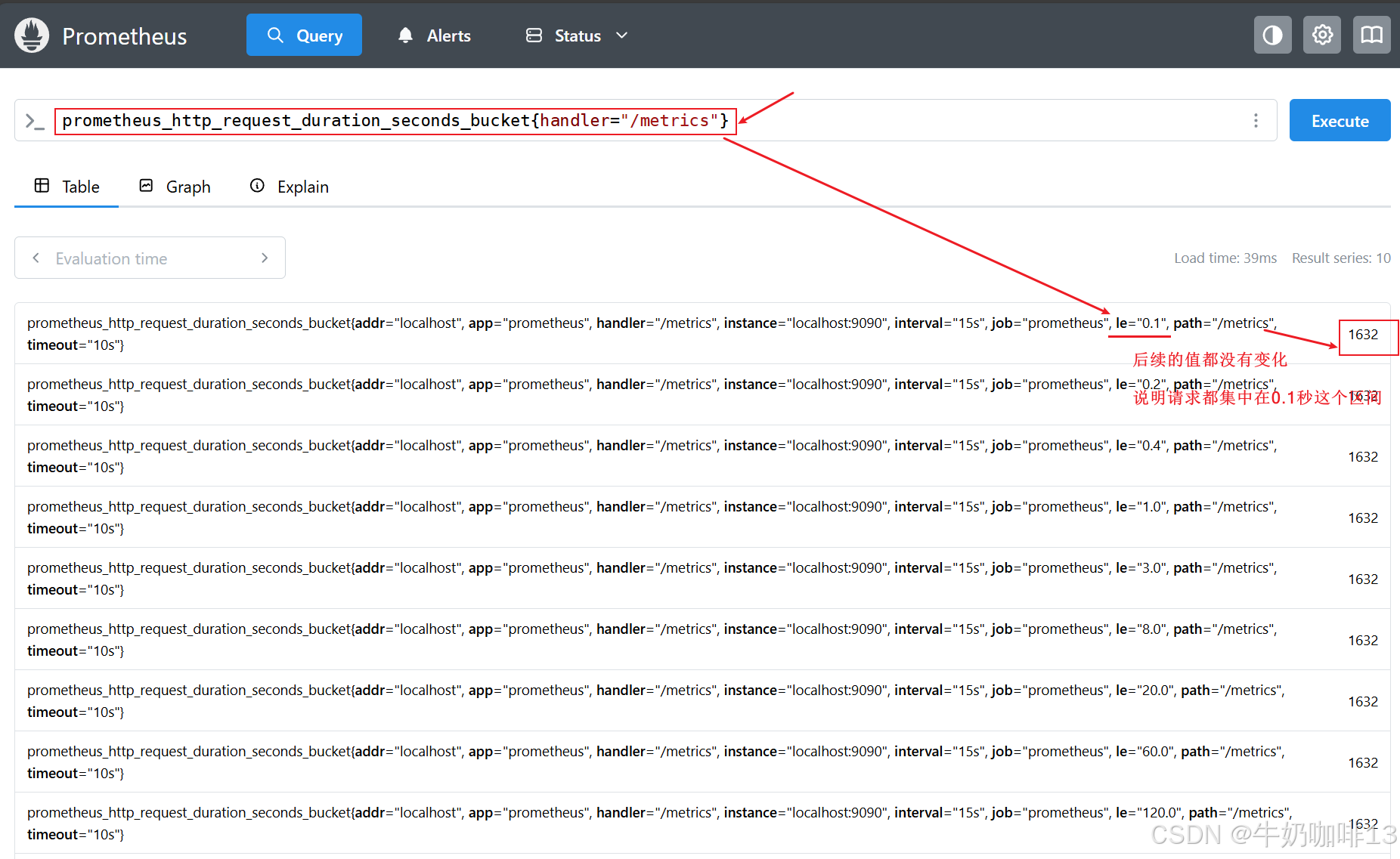 在 prometheus 内部,直方图被实现为一组时间序列,每个序列代表指定桶的计数(例如10ms以下的请求数、25ms以下的请求数、50ms以下的请求数等)。 在 prometheus 中每个 bucket 桶的计数器是累加的,这意味着较大值的桶也包括所有低数值的桶的计数。在作为直方图一部分的每个时间序列上,相应的桶由特殊的 le 标签表示。le 代表的是小于或等于。