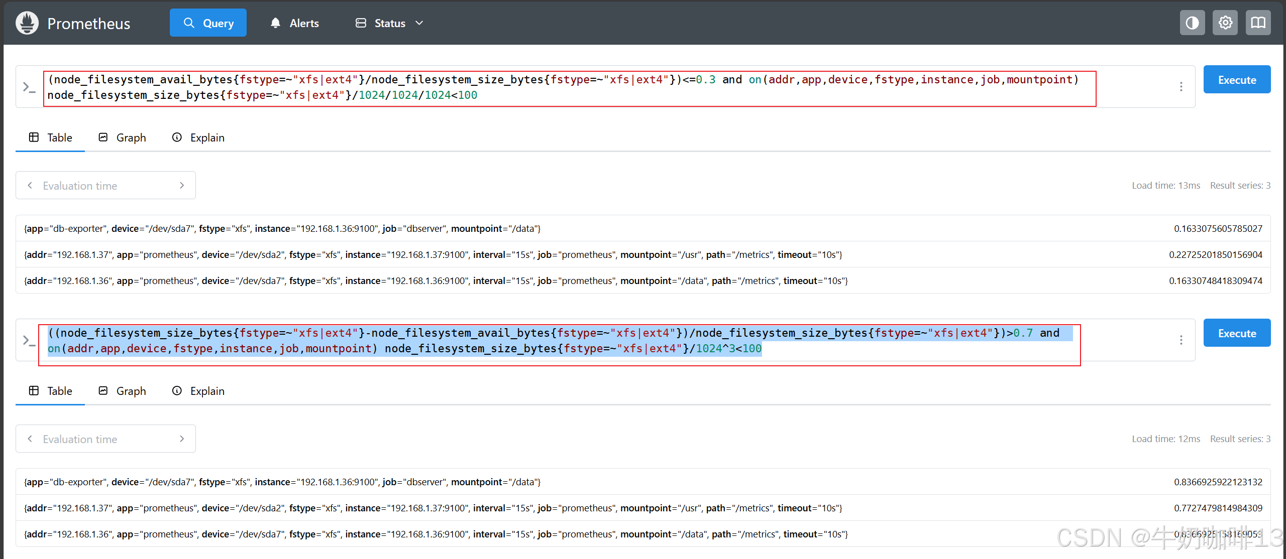 #示例2-【and】关于磁盘的使用率,有的磁盘分区很大,比如 10T,有的分区很小,比如 100G,像这种情况如果只是用磁盘的使用率做告警就不太合理,比如 disk_used_percent{job="dockerserver"} > 70 表示磁盘使用率大于 70% 就告警。对于小盘,这个策略是合理的,但对于大盘,70% 的使用率表示还有非常多的空间,就不太合理。这时我们希望给这个策略加一个限制,只有小于 200G 的硬盘在使用率超过 70% 的时候,才需要告警,这时我们就可以使用 and 运算符