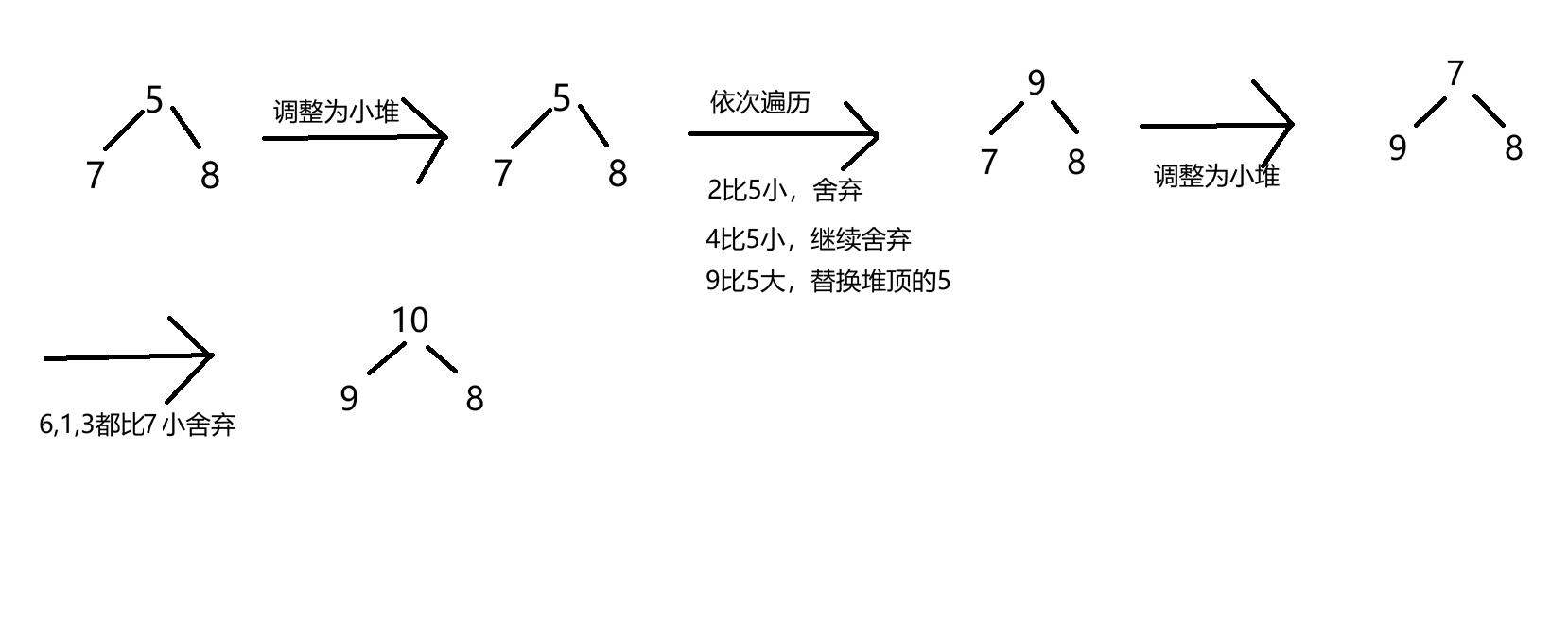 - 如果x>堆顶元素的数据,将堆顶元素替换成x,重新向下调整为小堆
