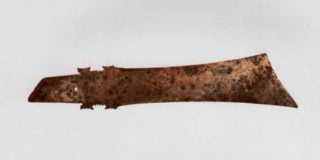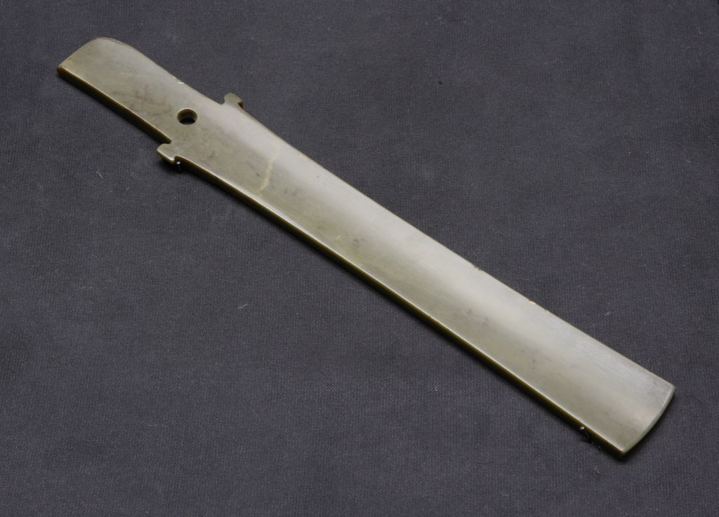 玉已受沁为黑褐色,通体光素,首端刃部内弧,锋利。近刃部打磨内凹。柄部两侧各出一小齿牙,柄端一孔,单面钻。