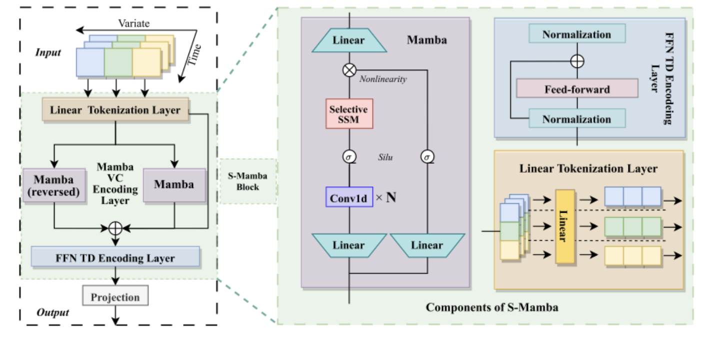 Transformer的注意力机制在计算时,其运算量与输入序列长度或变量数量的平方成正比 ,这意味着,如果输入数据的长度或变量数量增加一倍 ,计算量会增加四倍 。在真实场景中,往往涉及大量的传感器和需要回溯很长的历史数据 ,这会导致计算开销急剧增加。相比之下,线性模型或Mamba 这类状态空间模型(State Space Model, SSM)具有线性复杂度(O(N)O(N)O(N)), 运算速度更快。