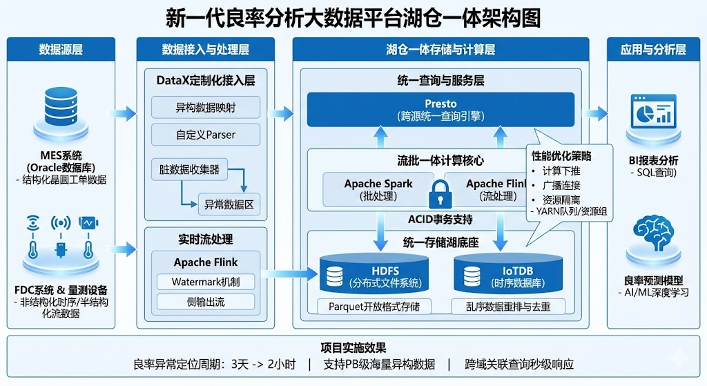 2024年3月,我参与了某大型半导体晶圆制造企业"新一代良率分析大数据平台"的研发工作,在项目中担任系统架构师,负责整体架构设计与技术选型。该企业面临生产数据规模大(PB级)、类型异构(结构化MES数据与非结构化时序数据并存)、时效性要求高的问题。传统单一的数据湖或数据仓库架构已难以满足全流程良率归因分析的需求。为此,我设计了一套基于"湖仓一体"理念的现代大数据架构:底层采用HDFS与IoTDB构建统一存储湖,使用Parquet开放格式存储数据;中间层利用Spark与Flink引擎实现流批一体计算,并引入ACID事务支持;上层通过Presto引擎实现跨源统一查询。本文将结合项目实践,论述湖仓一体架构的事务一致性支持、开放存储格式、存算分离、多样化计算支持四大关键特征,并详细阐述在项目实施过程中如何解决异构数据类型映射、乱序数据处理及跨域关联查询性能优化等实际问题。平台上线后,良率异常定位周期从3天缩短至2小时,有效支撑了先进制程的良率爬坡。