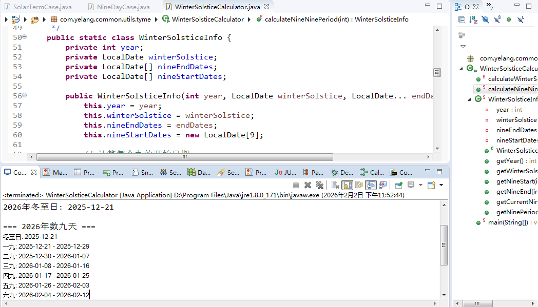 代码采用单一职责原则设计,WinterSolsticeCalculator作为工具类提供静态计算方法,内部类WinterSolsticeInfo专门封装数九天相关数据,实现了计算逻辑与数据存储的分离。