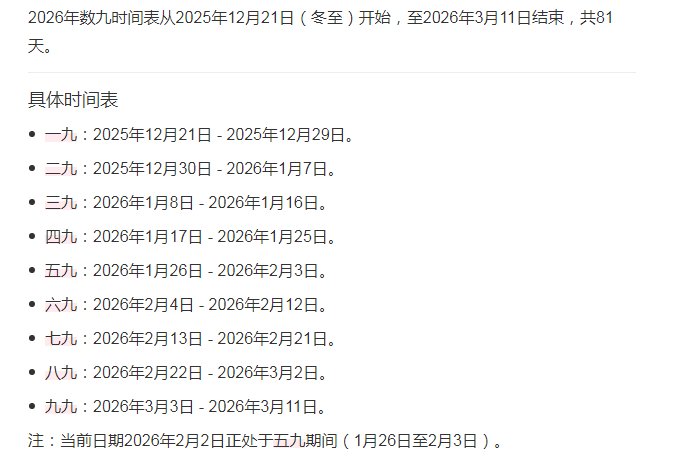 - 数九天计算的核心是固定周期偏移:以冬至日为 T0,一九为 T0+1 至 T0+9 天,二九为 T0+10 至 T0+18 天,以此类推。
