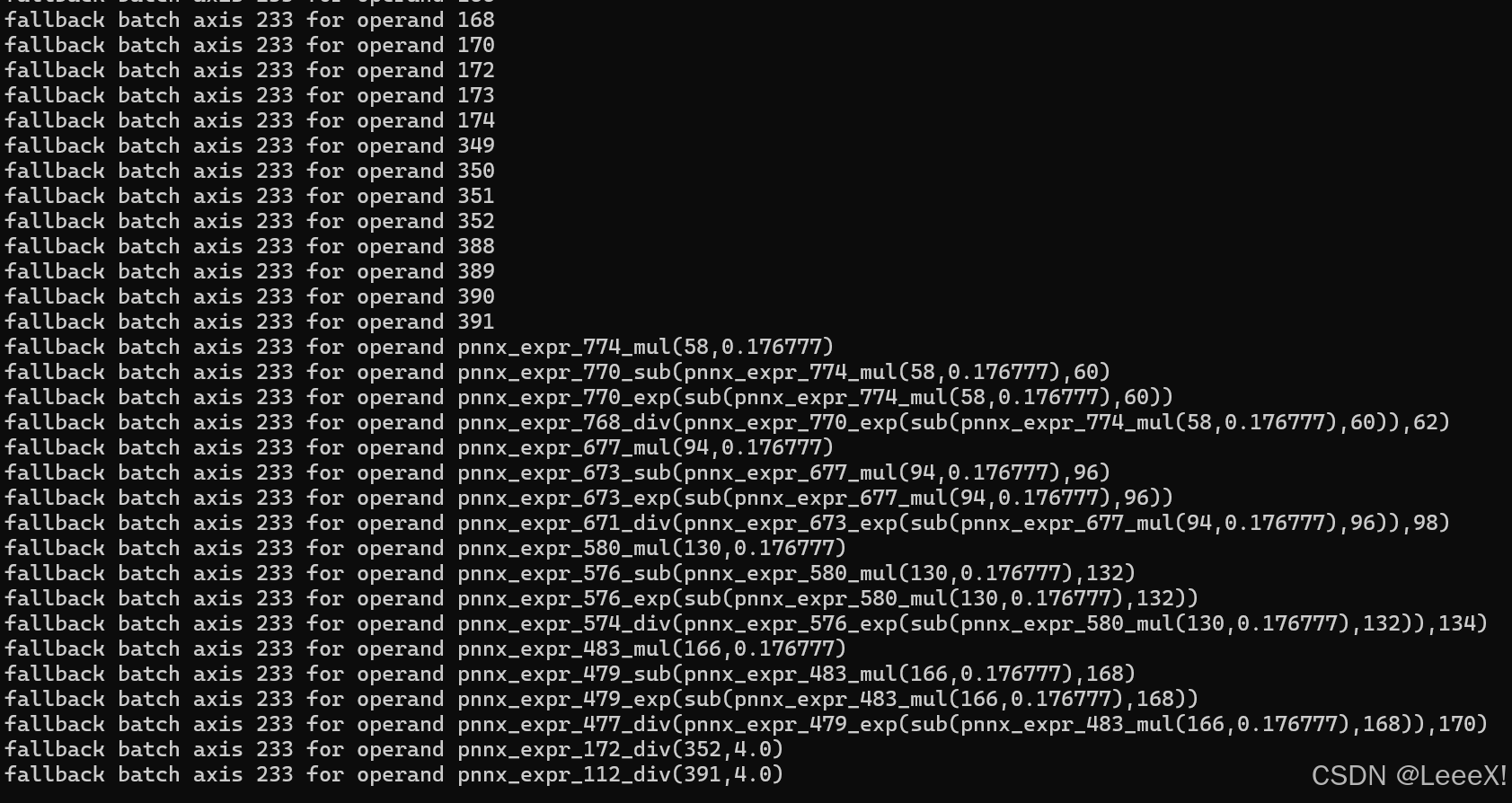 在进行转换时,会出现一些警告,提示强制将所有1维tensor(shape.size() == 1)的batch轴设置为233,和对于所有经过batch轴推断过程后仍然没有设置__batch_index参数的operand,作为最后的fallback,将其batch轴设置为233,经过测试,对于后面结果暂时还没有影响...