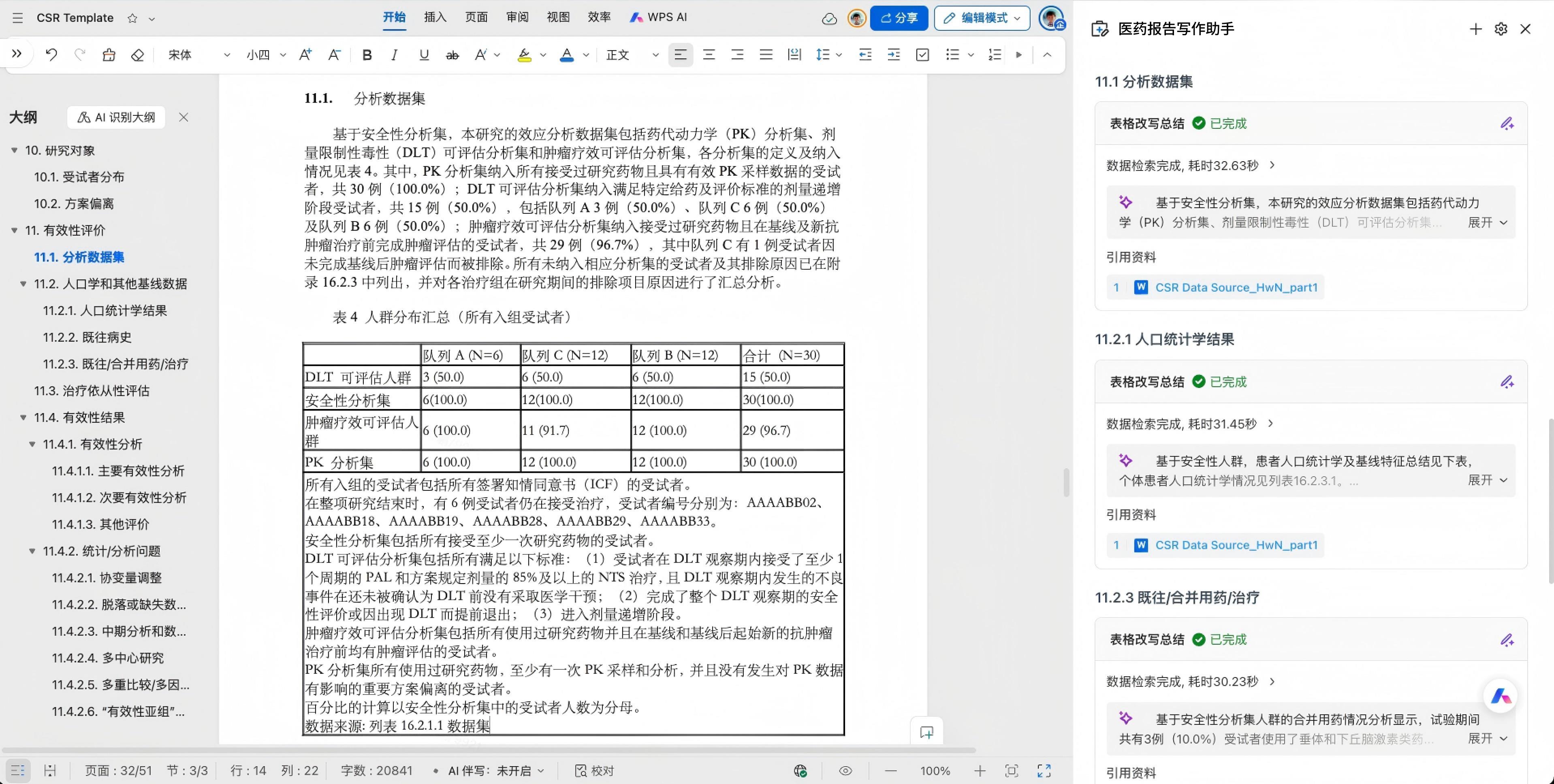 2月3日,继WPS 365"企业大脑"落地上海,金山办公发布行业首个AI医药报告写作助手------WPS 365 Medical SmartReport,聚焦以医药临床研究报告(CSR)为代表的、符合国际人用药品注册技术协调会(ICH)规范的医药报告撰写场景,直击效率瓶颈与合规痛点,为药企提供从数据整合、表格处理到合规输出的全流程智能化支撑。
