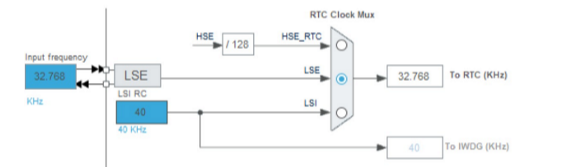 • LSE振荡器时钟(通常是32.768KHz)(最常用的),可以配置为1hz(经过分频之后)