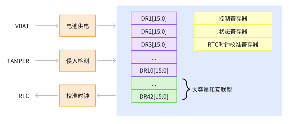 • 备份寄存器(BKP)在大容量STM32芯片中通常是42个16位寄存器(共84字节),用于存储用户数据。它们位于备份域中,当VDD电源切断时,可由VBAT引脚连接的备用电池维持供电保证数据不丢失。当系统从待机模式唤醒、或发生系统复位/电源复位时,BKP数据不会被清除(除非主动进行备份域复位或VBAT断电)。