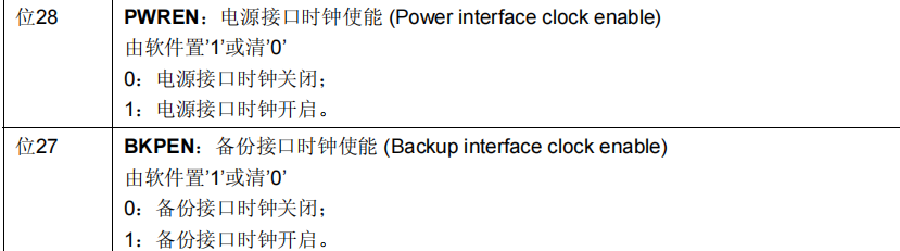 • 通过设置寄存器RCC_APB1ENR的PWREN和BKPEN位来打开电源和后备接口的时钟。