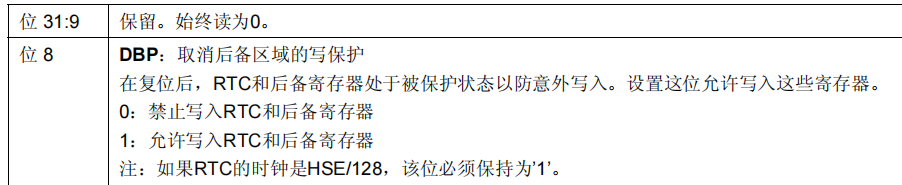 • 电源控制寄存器(PWR_CR)的DBP位来使能对后备寄存器(BKP)和RTC的访问,如图: