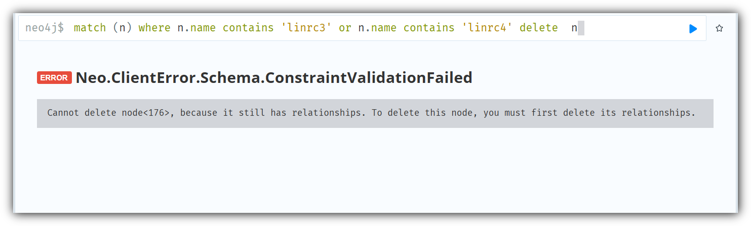 // 报错 == 删除节点前必须删除关系 == 否则执行失败