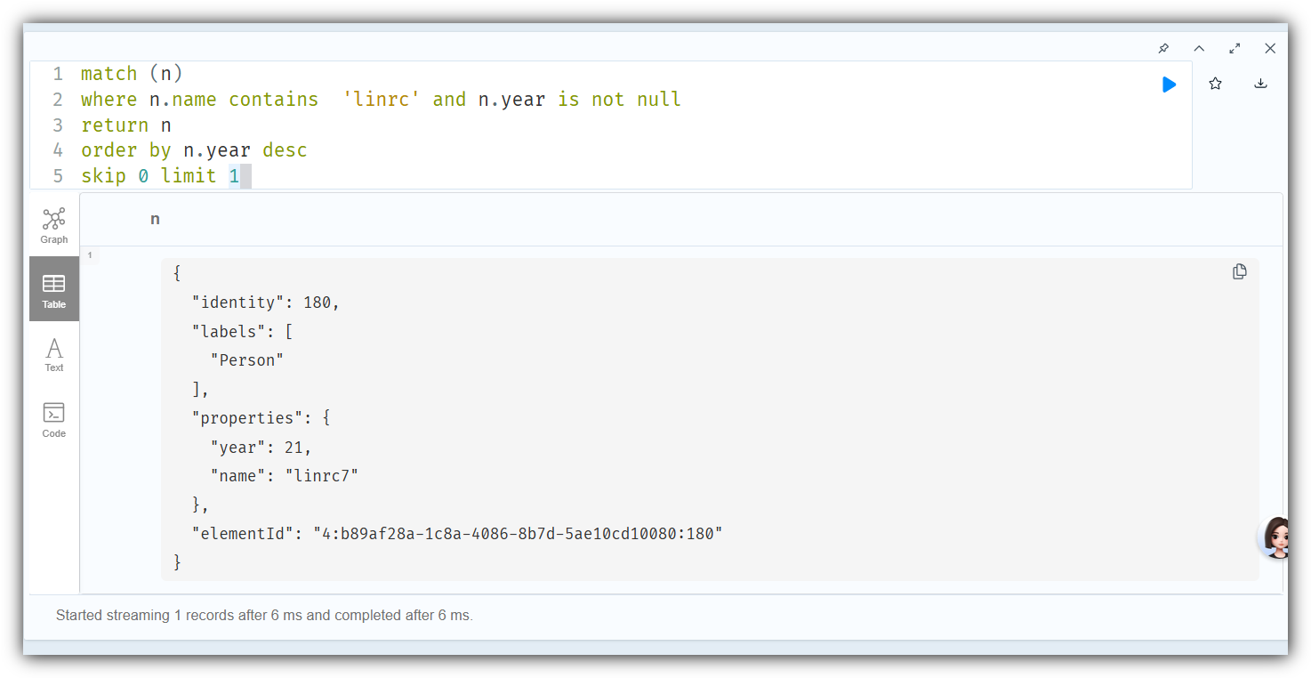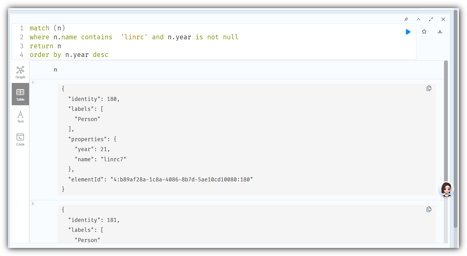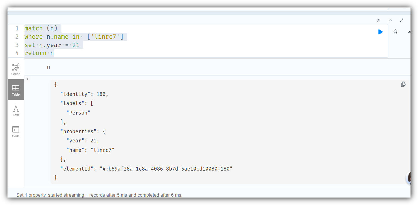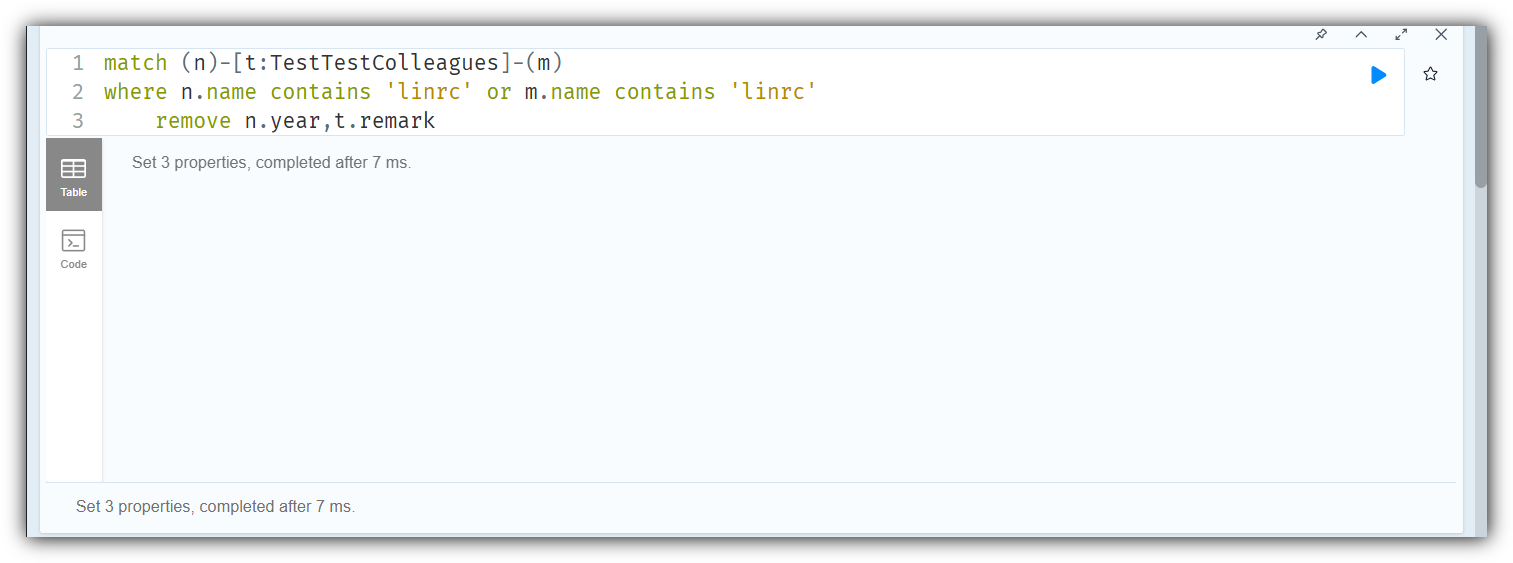 create (person1:Person {name: 'linrc5',year:18})-[:TestTestColleagues {company:'测试测试电信总公司',remark:'备注'}]->(person2:Person {name: 'linrc6',year:19});