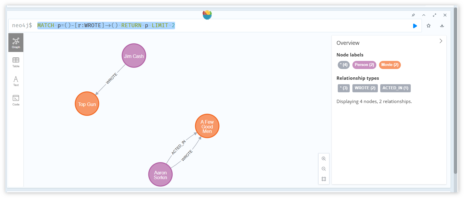 MATCH p=()-[r:WROTE]->() RETURN p LIMIT 2