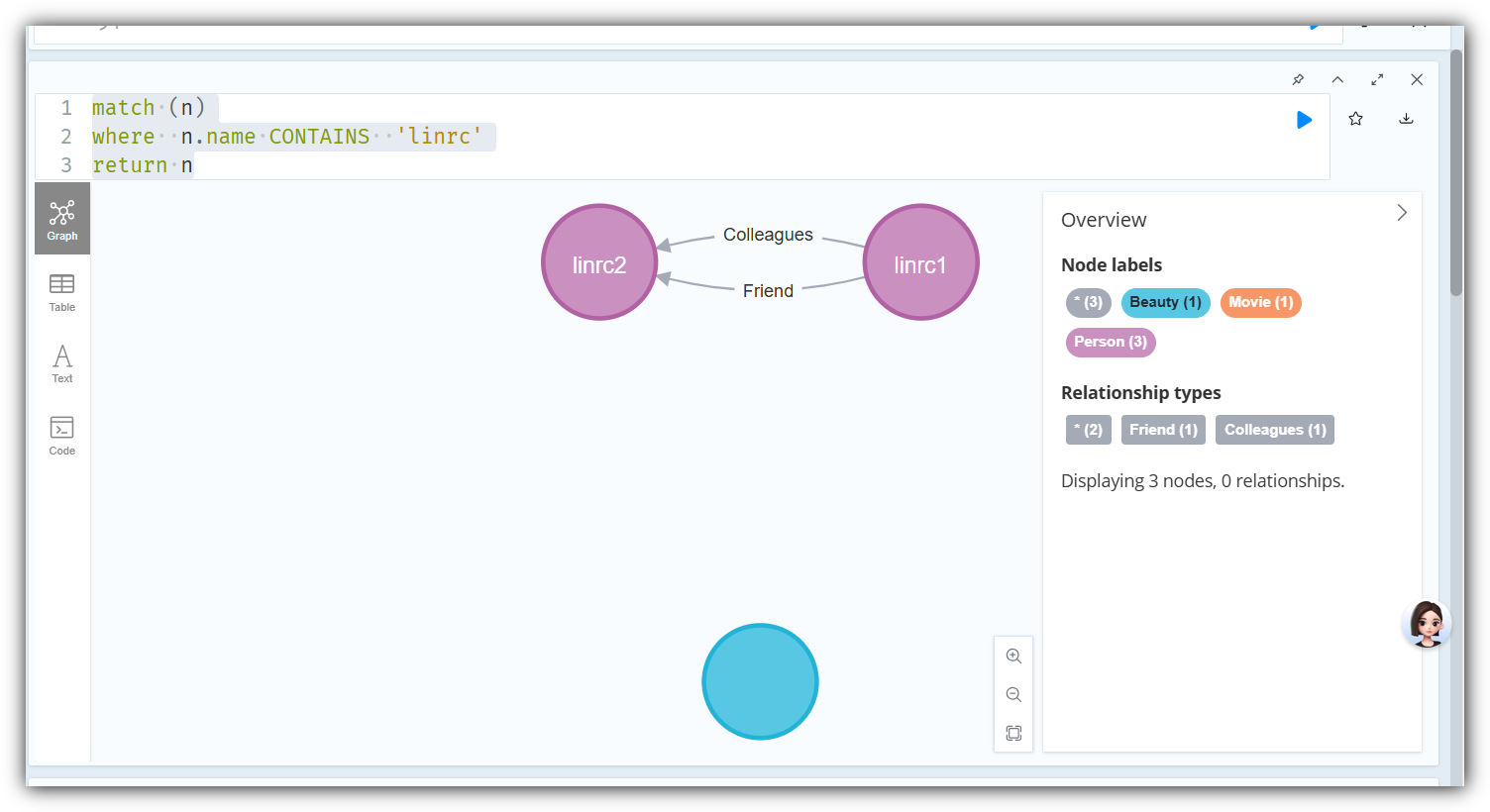 create (person1:Person {name: 'linrc7',year:18})-[:TestTestColleagues {company:'测试测试电信总公司',remark:'备注'}]->(person2:Person {name: 'linrc8',year:19});