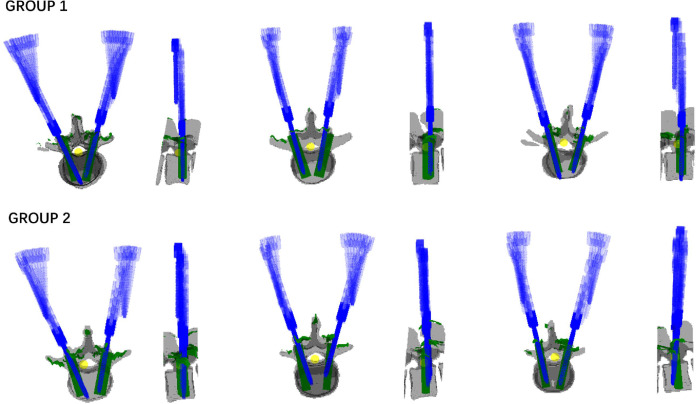 图5. 评估椎弓根螺钉置入术(PSP)性能的相关术语。插入深度(bt)、金标准、损伤长度(mtdam)和安全距离(ltsafe)分别用蓝色、绿色、橙色和红色可视化。此处金标准由轨迹中心(p̄center)、方向(v̄drct)、椎弓根宽度(PW)和轨迹长度决定的圆柱体表示。