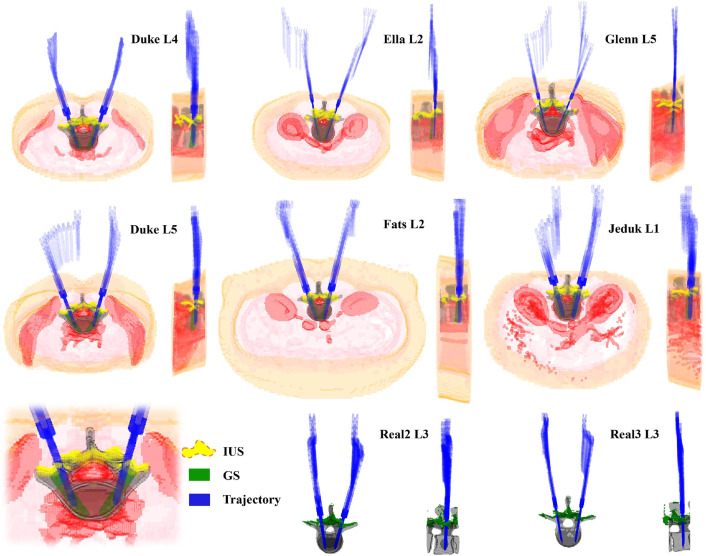 图17. 使用合成和真实超声重建数据,由我们策略规划的示例轨迹的前视图和侧视图。选择不同椎骨水平、初始姿态和人体模型的规划轨迹,以展示我们方法的有效性。合成术中超声重建(IUS)呈黄色,真实超声重建呈绿色。前两行中,椎骨内部的绿色区域表示人类规划师标注的金标准(GS)轨迹。