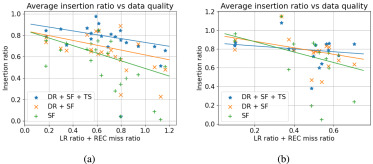 图14. 每种方法在不同重建质量椎骨上的性能。(a) 第一组数据集的插入率,SafeRPlan + DR + SF + TS、DR + SF 和 SF 的平均安全率分别为 99%、96% 和 92%。(b) 使用在第一组上训练的策略在第二组数据集上的插入率,平均安全率分别为 88%、92% 和 71%。对于每种方法,使用线性回归来说明性能与重建质量之间的相关性。