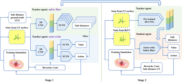 图6. 带有随机扰动3D图像状态的安全强化学习的教师-学生学习。我们的安全深度强化学习智能体包含一个演员-评论家网络和一个基于学习的安全过滤器,两者都带有3D卷积神经网络(CNN)特征编码器。安全过滤器在策略部署期间预测到不安全状态的距离以确保安全行为。在第一阶段,我们在使用地面真实(GT)椎骨上表面构建状态的仿真中训练一个教师智能体。然后在第二阶段,我们训练一个学生智能体,基于随机合成超声重建(RsUS)进行规划。为了提高训练性能,我们使用教师智能体的特征编码器来指导学生智能体的特征提取。