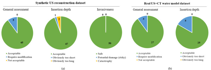图12. 脊柱手术专家外科医生对脊柱手术定性评估结果。(a): 合成超声重建规划轨迹的定性评估结果。(b): 真实水模型数据集规划轨迹的定性评估结果。