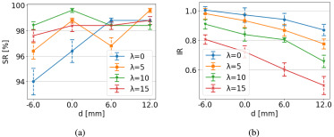 图15. 5个人体模型数据集安全过滤器的平均敏感性分析。(a) 不同λ和d下的安全率(SR)。(b) 不同λ和d下的插入比(IR)。