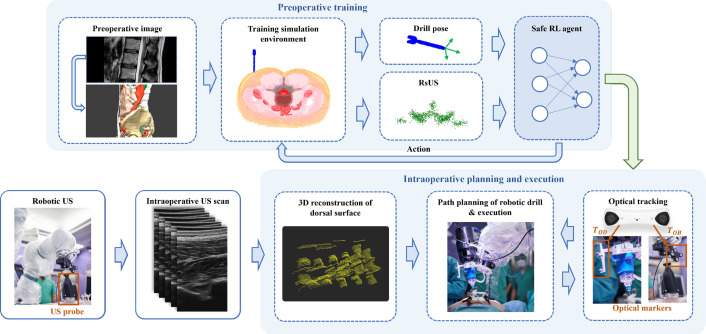 图1. 我们提出的SafeRPlan框架概述。在术前训练期间,我们利用分割后的术前MRI数据构建了一个带有随机合成超声重建(RsUS)的训练仿真环境,以训练安全强化学习(RL)智能体。在手术期间,我们假设在手术前首先进行机器人超声(Li等人,2023b)的背侧表面重建。然后,经过训练的智能体直接使用这种术中超声重建来规划运动指令序列,以钻孔后续椎弓根螺钉置入(PSP)的路径。手术工具的实时姿态通过光学跟踪系统进行跟踪,并用于更新智能体的状态输入。