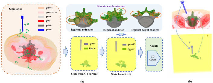 图3. 椎弓根螺钉置入术(PSP)的训练仿真环境。(a) 仿真环境和领域随机化;(b) 3D图像状态的构建。Vfree、Vpreserve、Vcort、Vcanc和Vno分别用橙色、粉色、浅灰色、深灰色和红色着色。来自真实超声重建数据的潜在效应(由橙色圆圈突出显示)用于生成随机扰动的合成超声重建(RsUS)。3D图像状态基于RsUS创建,仅包含3个标签:钻头(蓝色)、重建(绿色)和空(黄色)。