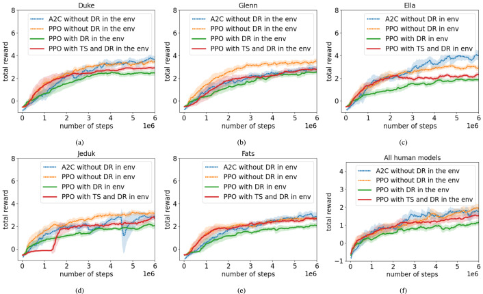 图9. 实验的训练曲线。(a)-(e): ITIS虚拟人群中每个单独人体模型的训练曲线。(f): 学习所有5个人体模型(来自整个ITIS基础数据集)的策略训练曲线。实线和虚线分别表示有和没有观测领域随机化(DR)的训练。因此,虚线黄色曲线的最终值应是实线曲线的上限。线条显示指标的指数移动平均值,阴影表示相应的方差。