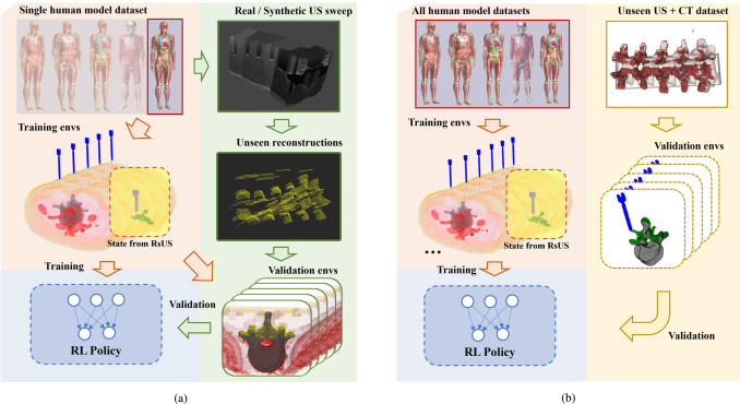 图8. 我们方法的训练和验证流程。(a): 针对未知观测噪声泛化的训练和验证流程。红色箭头表示为每个人体模型训练RL策略的流程。绿色箭头说明了如何基于未知重建构建相应验证环境的流程。对于验证环境,重建与GT骨模型对齐。(b): 针对未知患者泛化的训练和验证流程。红色箭头表示为所有人体模型训练RL策略的流程。黄色箭头显示了基于未知US和CT数据集的验证流程。在验证环境中,真实US重建被着色为绿色。