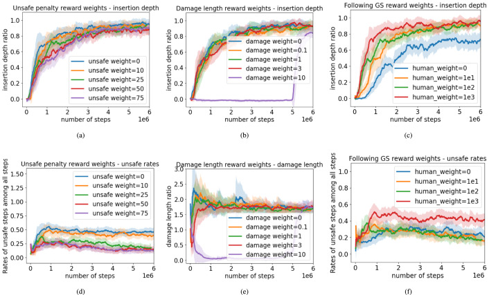 图19. 奖励权重的消融研究。(a), (d): 不安全惩罚 (w3);(b), (e): 损伤长度惩罚 (w2);(c), (f): 遵循金标准奖励 (w4)。对于损伤长度,奖励权重 w2 的影响与其他权重相比不显著,除了过大的权重也会阻止智能体探索。这可能是因为较小的 w2 已经促使智能体直接钻入软组织。