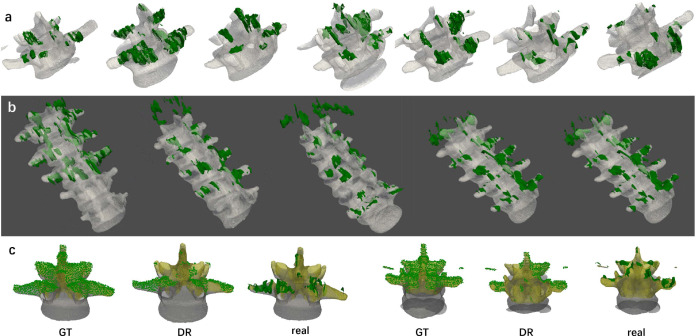 图7. 真实志愿者数据集样本和领域随机化的有效性。(a) 用于训练和验证的第一组真实人体数据集示例。(b) 专门用于验证的第二组真实人体数据集示例。仅选择具有足够表面重建的椎骨用于实验目的。骨表面重建和分割的骨骼CT分别用绿色和灰色着色。(c) 领域随机化有效性的演示。对于所示的两个示例椎骨,我们可以在100次随机试验中生成一个具有与真实重建(real)相似点分布的合成重建(DR)。