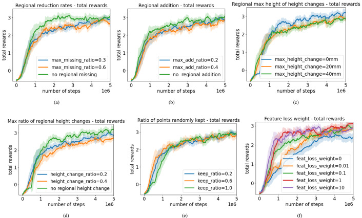 图18. 领域随机化和教师-学生学习的消融研究。(a): 训练对区域减少率的敏感性;(b): 训练对区域增加的敏感性。(c), (d): 训练对区域高度变化的敏感性;(e): 训练对点云密度的敏感性,通过随机保留一定比例的点来控制;(f): 训练对特征损失权重的敏感性。