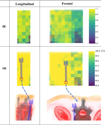 图16. 训练策略轨迹性能对初始位置的敏感性分析示例。不同3D初始位置的安全率(SR)和插入比(IR)值分别在纵向和冠状平面上进行说明。每个像素处的标量值是如果钻头在该像素位置初始化,规划轨迹的性能(IR或SR)(对于IR,解剖结构被省略)。