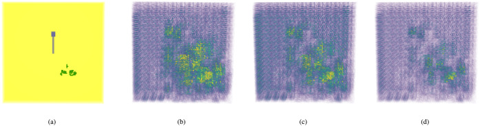 图20. 最大动作对数、价值函数和不安全区域预测距离的CNN显著图。(a) 带有椎骨表面重建和钻头的3D图像状态。(b) 最大动作对数的CNN显著图。(c) 价值函数的CNN显著图。(d) 不安全区域预测距离的CNN显著图。骨骼表面周围区域的梯度范数高于其他图像位置。