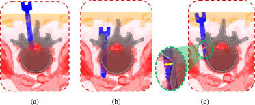 图10. 我们任务中不可接受的情景。(a) 损害安全关键解剖结构。(b) 穿透椎骨。(c) 过多部分穿透到侧向软组织。超出椎弓根区域最宽的部分用黄色表示,用于Gertzbein-Robbins (GR) 分类。此指标仅用于验证。