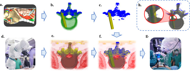 图2. 基于表面重建的配准技术规划框架。(a) 从分割的术前图像中提取的解剖结构;(b) 骨模型(绿色)和术前规划(黄色圆柱体);(c) 提取的表面特征和规划;(d) 术中机器人超声扫描;(e) 从分割的术中数据重建的表面(黄色点),叠加在患者真实解剖结构上;(f) 配准和真实世界中生成的规划轨迹(黄色圆柱体);(g) 机器人钻孔或引导的规划;(h) 噪声表面重建可能导致不可接受规划的示例;尽管配准误差可能很低,但估计的轨迹(黄色圆柱体)与脊髓重叠,这是不安全的。