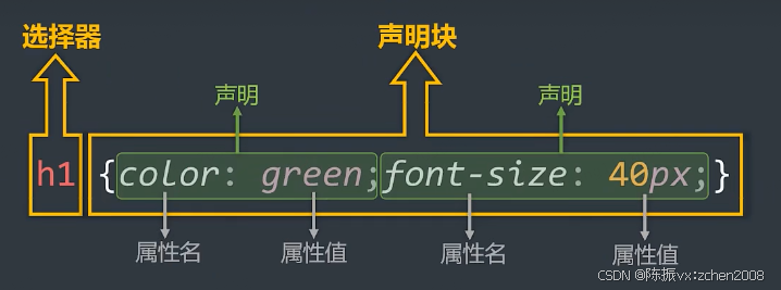 - 声明块:设置具体的样式(声明块是有一个或多个声明组成的),声明的格式为:属性名: 属性值;