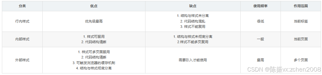 - 书写繁琐,样式不能复用、并且没有体现出结构与样式分离的思想,不推荐大量使用,只有对当前元素添加简单样式时,才偶尔使用。