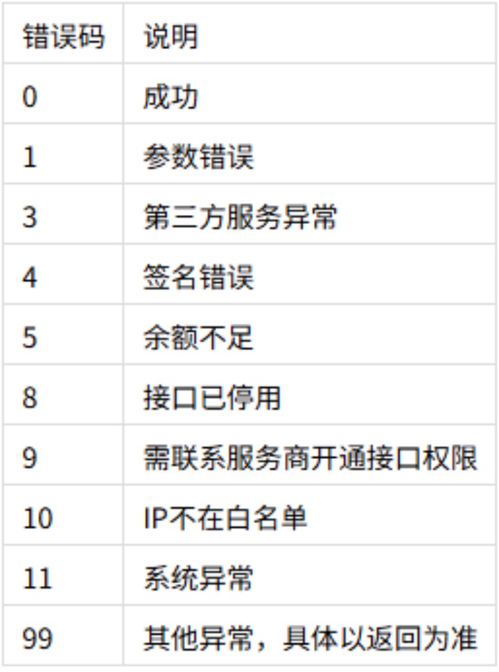 常见错误码处理建议:错误码0表示成功,1表示参数错误需检查输入,4表示签名错误需排查签名算法,5表示余额不足需及时充值。如果遇到错误码10.说明调用方IP不在白名单中,需要联系服务商添加。错误码3和11分别表示第三方服务异常和系统异常,这类错误通常是临时性的,可以稍后重试。