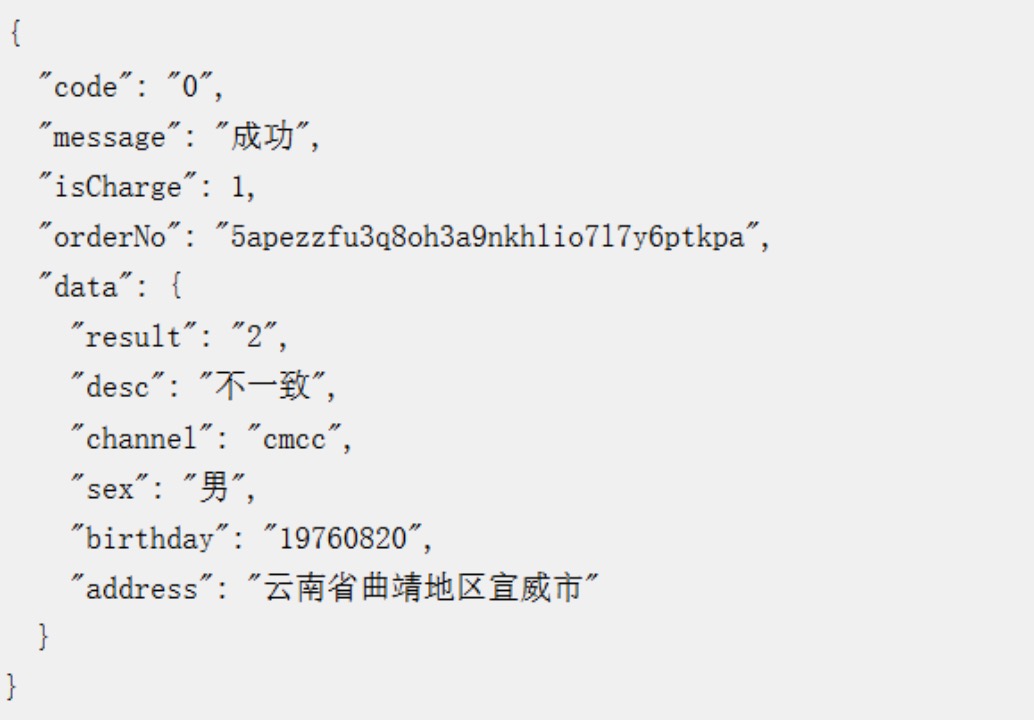 当接口调用成功时,会返回一个JSON格式的响应数据。响应中包含基础信息字段和验证数据对象。基础信息包括调用状态码、描述信息、是否计费标识和订单流水号。data对象中包含了详细的验证结果,包括三要素是否一致、运营商类型以及从身份证号中解析出的性别、生日和籍贯信息。