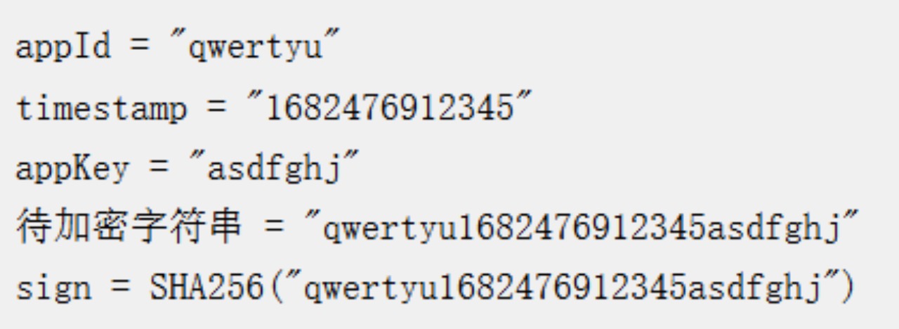 首先获取服务商分配的appId和appKey,然后生成当前时间的毫秒级时间戳timestamp。接下来按照"appId + timestamp + appKey"的顺序拼接字符串,注意拼接顺序不能错误。最后对拼接后的字符串进行SHA256加密,得到最终的签名sign。
