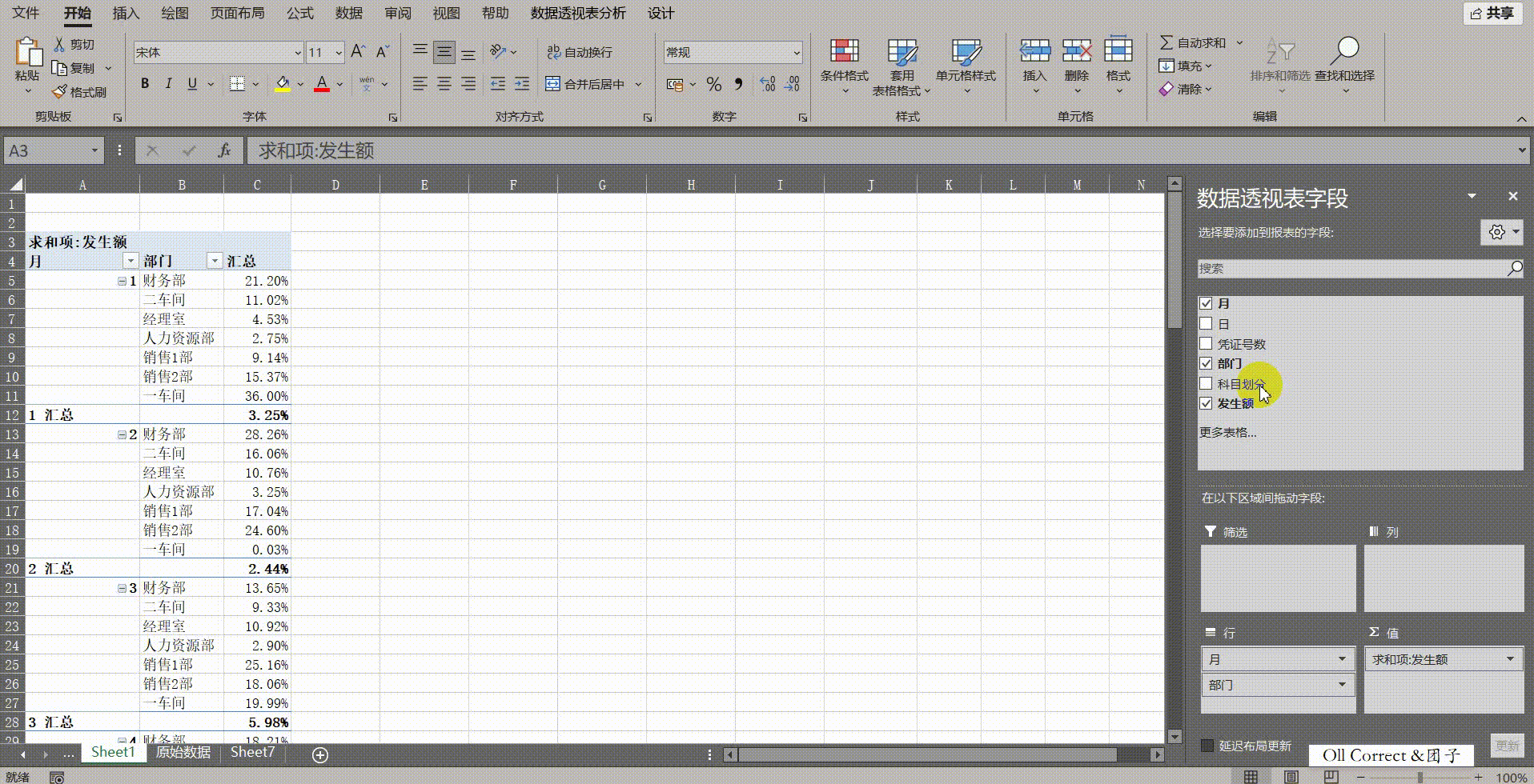 问题八:如果我把部门和月份都放在行区域(形成"月>部门"的上下级关系),如何计算"财务部"占它所属"一月份"总额的百分比?