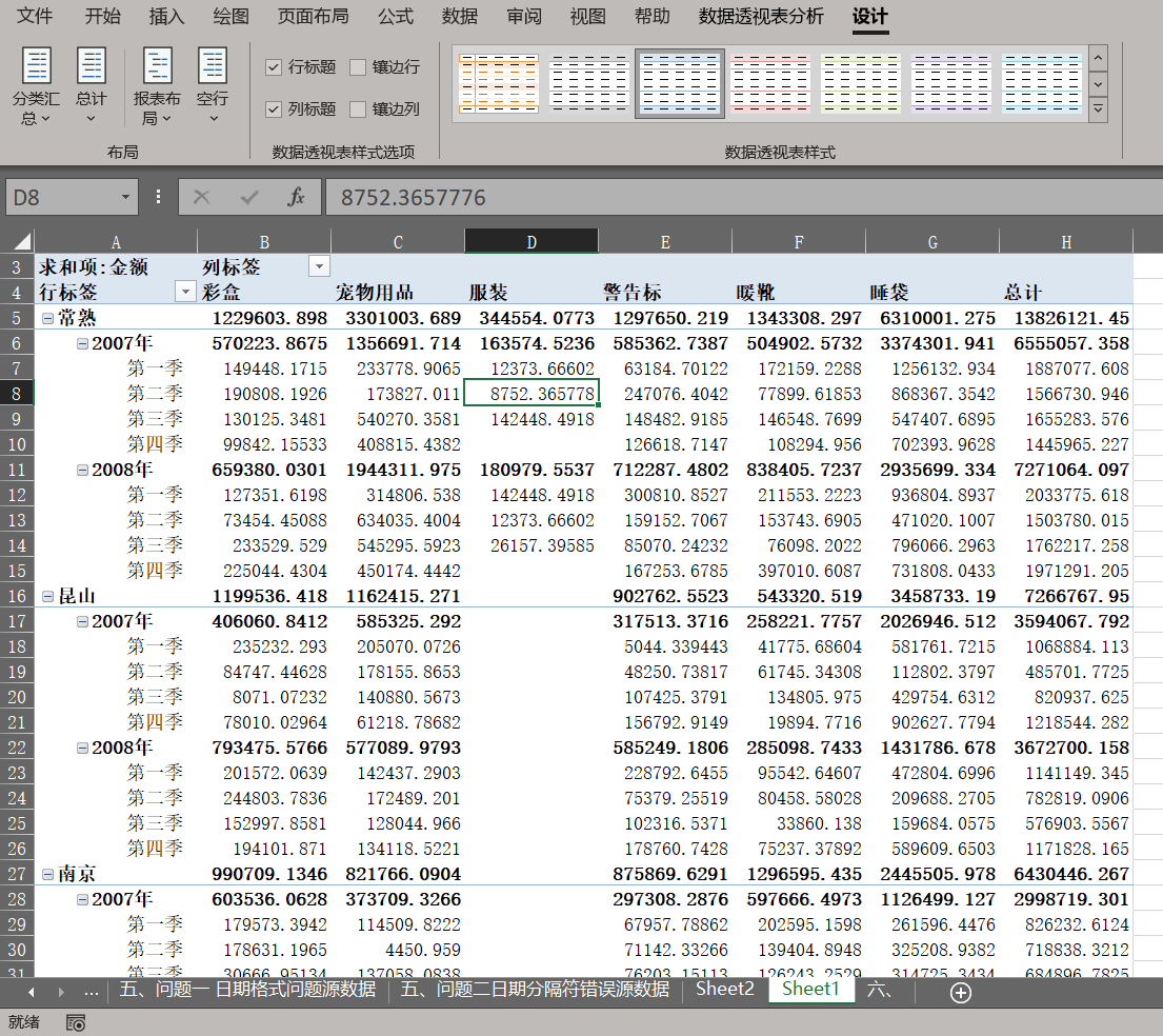 场景需求: 默认情况下,透视表会自动生成各类小计(如"2007年汇总")和行列总计。但在某些汇报场景中,我们可能只需要看明细数据,或者只需要看列总计而不需要行总计。过多的汇总行会让表格显得臃肿,此时需要精准控制它们的显示与隐藏。