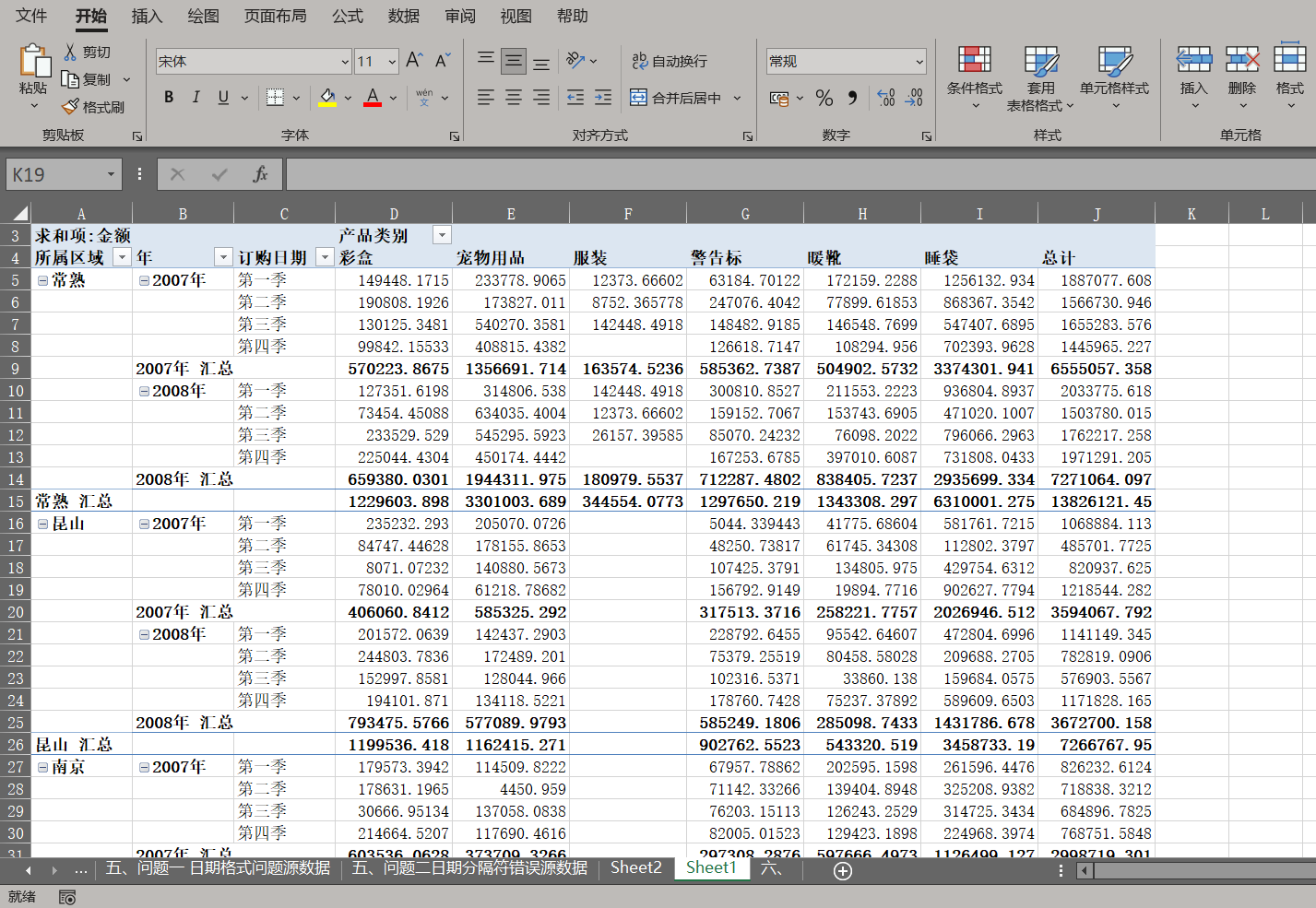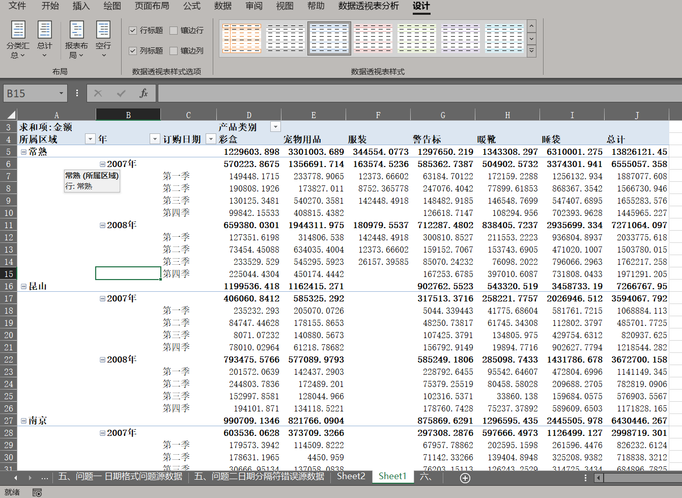 准备数据表: 同样先插入数据透视表并开启经典布局。将【所属区域】拖至行字段,将【订购日期】拖至其右侧并按【年】和【季度】组合。将【产品类别】拖至列字段,【金额】拖至值字段。此时表格中会显示大量的"2007年 汇总"、"2008年 汇总"。