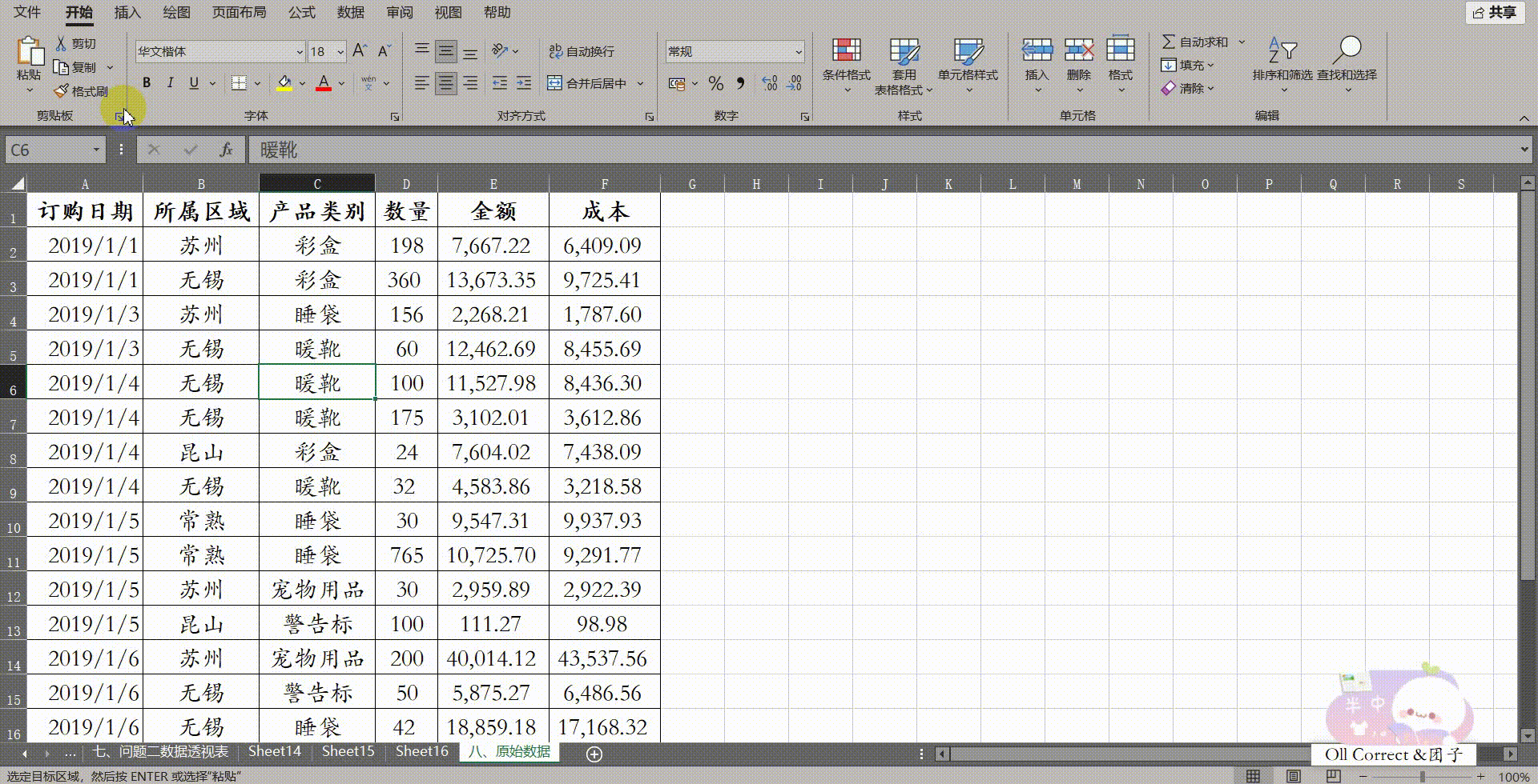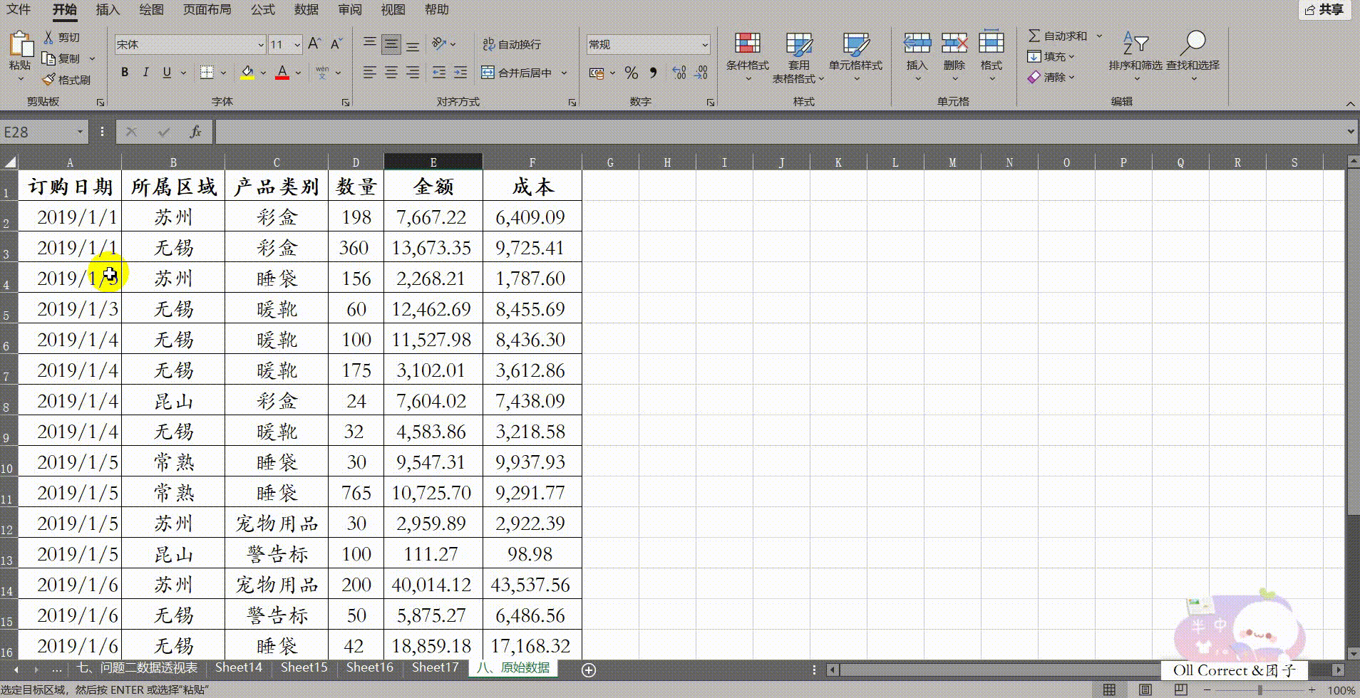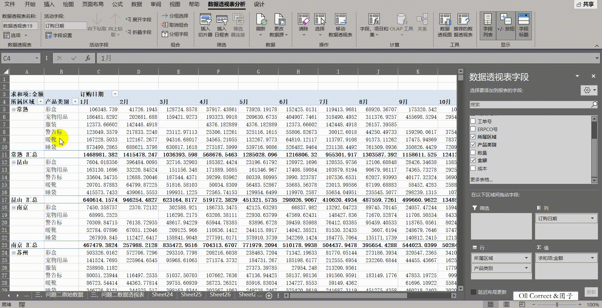 操作步骤: 首先,点击原始数据Sheet中的任意单元格,插入数据透视表并保持默认设置新建。为了方便后续直观地拖拽字段,我们需要开启经典布局:在透视表区域点击右键,选择【数据透视表选项(++O++ )】,在【显示】选项卡中勾选【经典数据透视表布局(启用网格中的字段拖放)(++L++ )】并确定。接着进行布局,将【所属区域】拖至行字段,将【产品类别】拖至【所属区域】右侧,再将【订购日期】拖入,并右键点击日期选择【组合】,步长设置为【月】。组合完成后,为了报表结构合理,将【订购日期】拖动至列字段区域,并将【金额】拖入值字段。 在开始分组前,我们可以通过手动排序让同类项相邻:将鼠标悬停在【暖靴】单元格的下边框,当鼠标变为四向箭头时,将其拖动到【服装】下方,使其与彩盒、宠物用品等聚在一起。接下来按住鼠标左键框选"彩盒、宠物用品、服装、暖靴"这四个单元格,点击右键选择【组合(++G++)】,并将生成的"数据组1"重命名为"A类商品";同理,选中"警告标"和"睡袋",右键组合并重命名为"B类商品"。最后,为了让报表只显示大类,将新生成的字段头【产品类别2】修改为【产品大类】,并在右侧字段列表中取消勾选原本细分的【产品类别】。