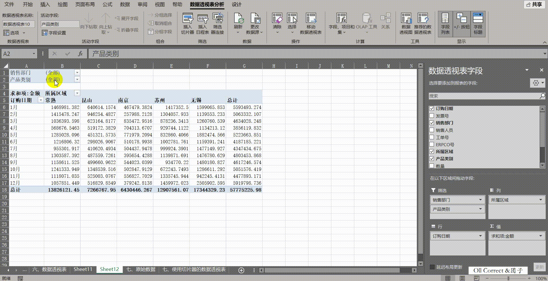 操作步骤: 第一步(制作折线图): 点击原始数据,插入第一个数据透视表。将【金额】拖入值,【订购日期】拖入行并组合为"年"和"月"。插入折线图,隐藏字段按钮并应用一种美观的【设计】样式。 第二步(制作柱形图): 再次点击原始数据(确保使用相同的数据源),插入第二个数据透视表。将【金额】拖入值,【所属区域】拖入行。插入柱形图,同样隐藏按钮并美化样式。 第三步(布局与连接): 将柱形图复制并粘贴到折线图所在的工作表中,进行初步排版。点击折线图背后的透视表,插入【产品类别】和【销售部门】的切片器。此时切片器只能控制折线图,我们需要建立连接:分别右键点击这两个切片器,选择【报表连接(++R++ )】,在弹出的列表中勾选【数据透视表2】(即柱形图对应的透视表),点击确定。 第四步(美化与防抖): 为了防止筛选时表格列宽变化破坏布局,右键点击两个透视表,分别在【数据透视表选项】中取消勾选【更新时自动调整列宽(++A++)】。最后利用Alt键进行对齐优化:拖动图表和切片器边缘时按住【Alt键】,它们会自动吸附到Excel单元格的边框线上。将【销售部门】切片器列数设为2,【产品类别】设为3,并按住Alt键将其整齐排列在图表旁边。现在,你就拥有了一个专业的动态仪表板,点击任意切片器,所有图表都会同步更新。