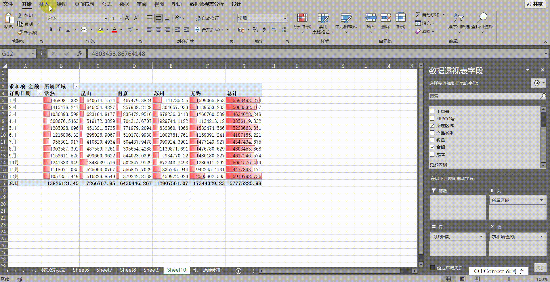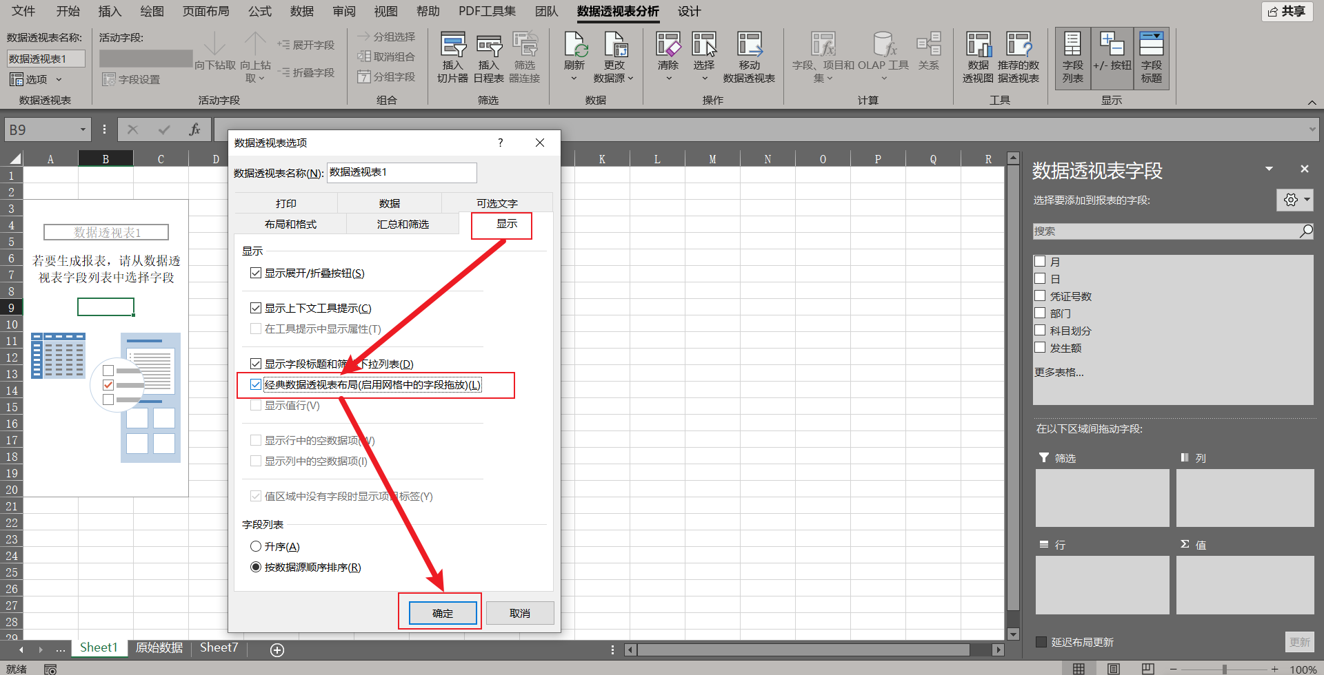 操作步骤: 首先打开原始数据表,点击任意单元格,通过【插入】选项卡点击【数据透视表】,在弹窗中直接点击确定以新建工作表。为了方便后续拖拽操作,建议先切换至经典模式:在透视表区域点击右键,选择【数据透视表选项(++O++ )】,切换到【显示】选项卡,勾选【经典数据透视表布局(启用网格中的字段拖放)(++L++ )】并确定。接着进行布局,在右侧【数据透视表字段】中,将【订购日期】拖入行区域,将【所属区域】拖入列区域,将【金额】拖入值区域。此时行标签显示的是具体日期,我们需要进行分组:右键点击行区域中任意一个日期单元格,选择【组合(++G++)】。在弹出的窗口中,【步长】列表里同时选中【月】和【年】(按住Ctrl键可多选,或直接分两次操作),点击确定。